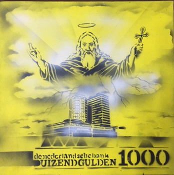 About the work Several elements come together in this work. At the bottom you can see a reference to a thousand-guilder banknote. This text forms the basis for the image of the headquarters of De Nederlandsche Bank. From the cloud cover rises the form of Jesus Christ, connected to the bank building by roots or lightning bolts. By bringing these different elements together, renowned street artist Hugo Kaagman creates space for a variety of associations and interpretations. Is he comparing the role of Jesus and De Nederlandsche Bank as protectors of society? Or is he, as a true punk, mocking the central role of money in our society?