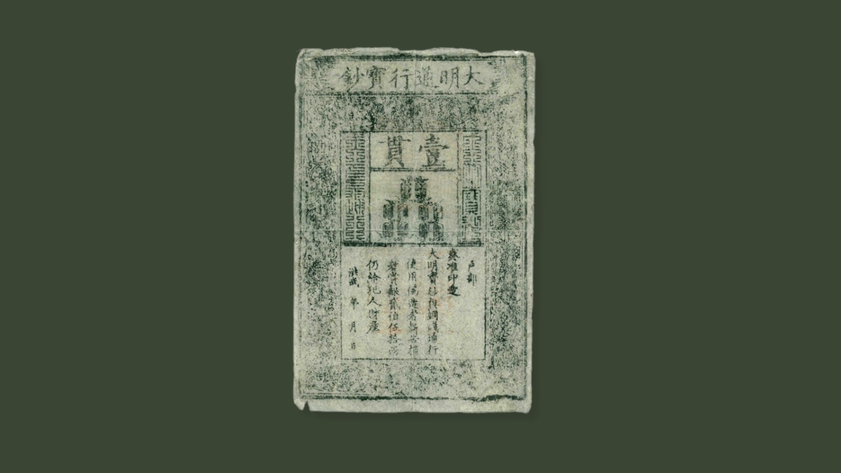 Papiergeld is een Chinese uitvinding en er circuleerden al biljetten in China tijdens de T’ang Dynastie (618-906). Dit biljet is gedrukt ten tijde van de Ming Dynastie (1368-1644).