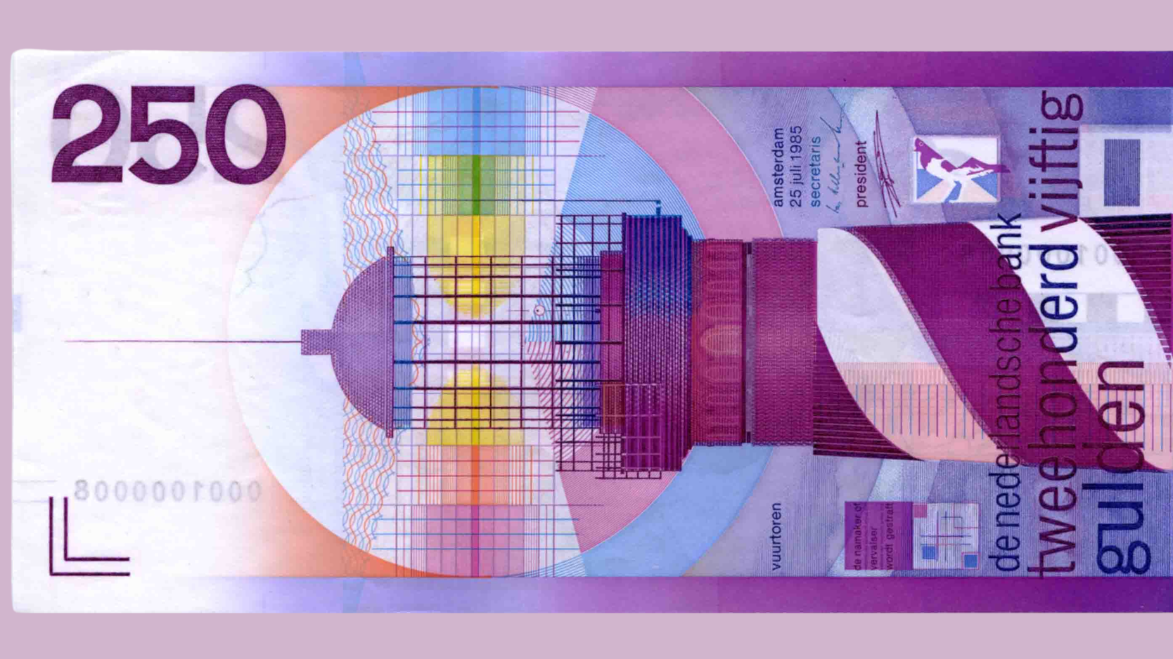 “Vrolijkheid, statigheid en waardigheid”. Dat is wat het 250-guldenbiljet van ontwerper R.D.E. (Ootje) Oxenaar moest uitstralen. De vuurtoren, geïnspireerd op die van Haamstede in Zeeland, was een herkenbaar en benoembaar Nederlands symbool dat perfect aan deze DNB-eisen voldeed. Door de dwarse plaatsing van de vuurtoren brak het ontwerp met de conventies en nodigde het uit tot interactie – de gebruiker moest het biljet namelijk ‘staand’ bekijken. Dat een loep hierbij ook geen overbodige luxe is blijkt uit een bijzonder detail. In letters met een hoogte van 0,2 mm is namelijk een gedicht te lezen: