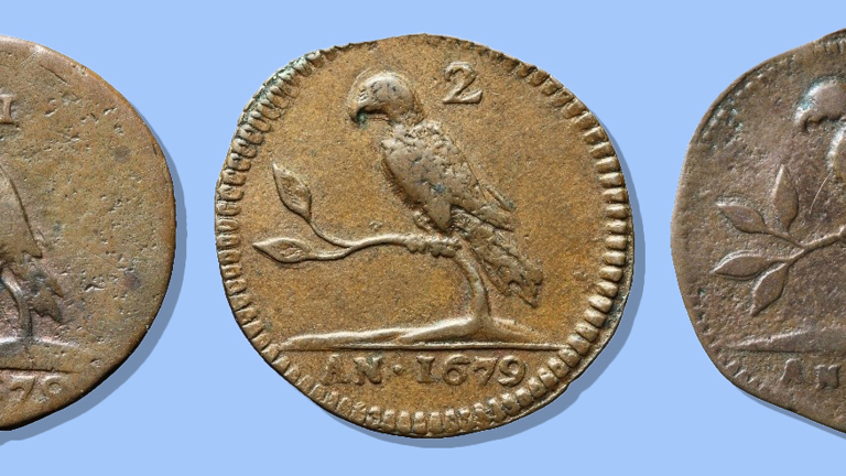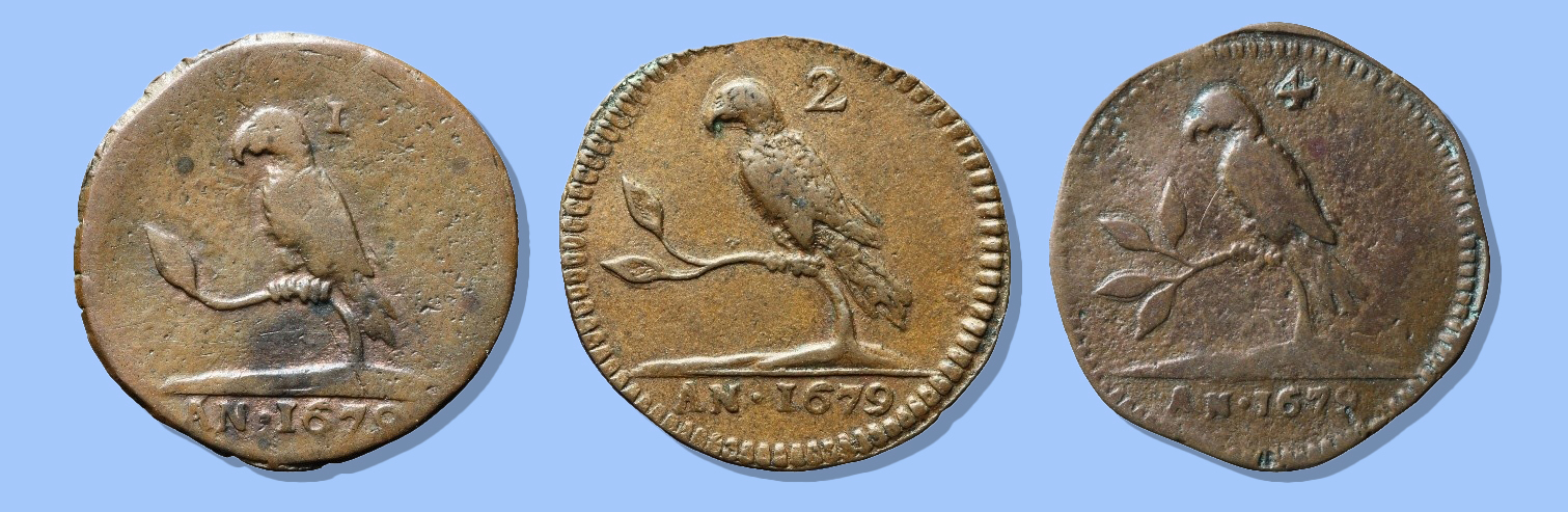 Collectie DNB, inventarisnummers DNB-33937 (duit); DNB-33936 (2 duit); BM-16579 (vier duit) Duit, Sociëteit van Suriname West-Indische Compagnie, geslagen in Enkhuizen (Nederland), 1679, koper.