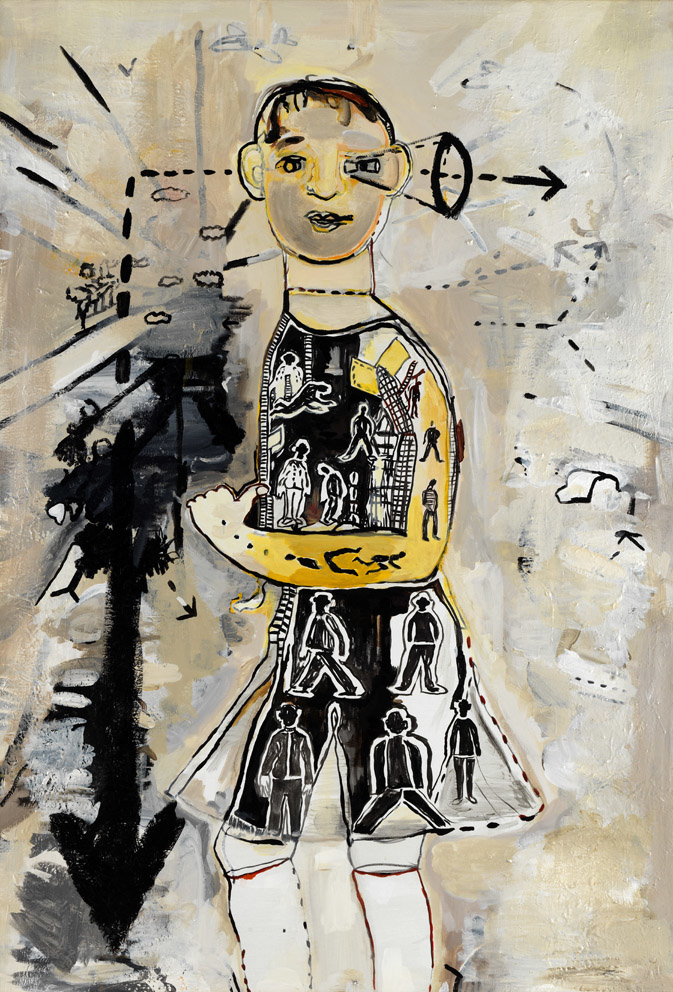 Er is iets vreemds aan de hand met de menselijke figuur op dit schilderij. De rechterarm van deze figuur lijkt plaats te hebben gemaakt voor zwarte pijlen en lijnen. En op de linkerarm en jurk van deze persoon (een kind, misschien?) zijn kleine, anonieme mensen en lijnen te zien die doen denken aan gebouwen en trappen. Het linkeroog is bovendien weergegeven als een soort cameralens. De mensfiguur lijkt een schematische schets uit een wetenschappelijk boek of misschien is het een half mens-half machine. Waar doet het jou aan denken?