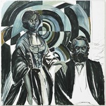 Rechtsonder zie je de Duitse filosoof Karl Marx. Zijn ideeën over de economie en klassenstrijd vormden de basis van het marxisme. Naast Karl staat zijn vrouw Jenny. Zij was een politiek activiste en had grote invloed op het werk van Karl. Door Jenny zo prominent naast Karl af te beelden verwijst Kensmil naar haar belangrijke rol – een rol die lang onderbelicht is gebleven. De donkere en gelaagde schilderstijl geeft het koppel bovendien iets onaards. Alsof de twee figuren samen een portaal vormen naar verborgen delen van de geschiedenis.