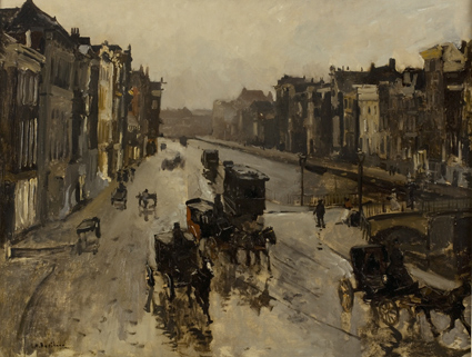 Op dit schilderij zie je het Rokin in Amsterdam aan het eind van de negentiende eeuw. Een enkeling loopt op straat en paardenkoetsen rijden in volle vaart voorbij. Zou het net geregend hebben? Dit werk is een momentopname van een alledaagse situatie. Je ziet weinig details, maar des te meer beweging en sfeer. Het leven in Amsterdam van meer dan honderd jaar geleden wordt hierdoor bijna invoelbaar…
